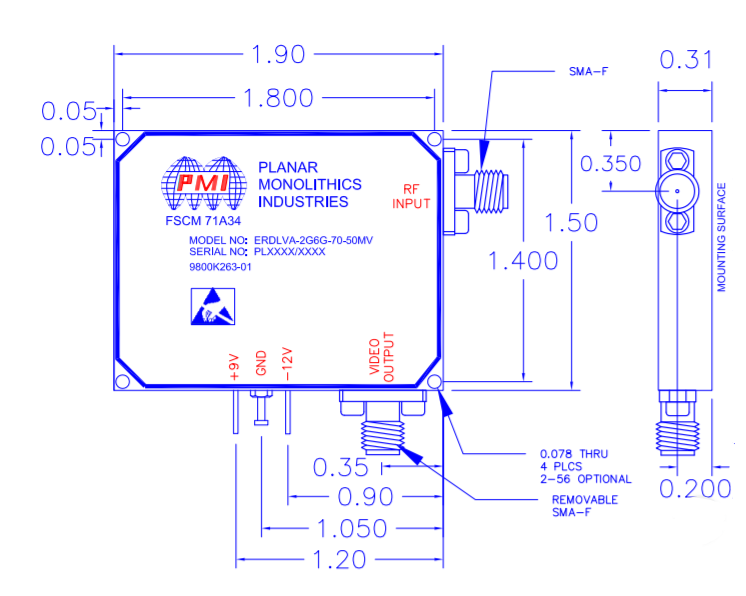 Quantic PMI Model ERDLVA-2G6G-70-50MV is a CW Immune Extended Range Detector Log Video Amplifier (ERDLVA) that operates from 2 to 6 GHz with a dynamic range of -65 to +5 dBm and the ability to interface with a long cable (30 meters), while maintaining high speed and flatness. This model has SMA female connectors and offers an ultra-small package size of 1.60" x 1.50" x 0.31".