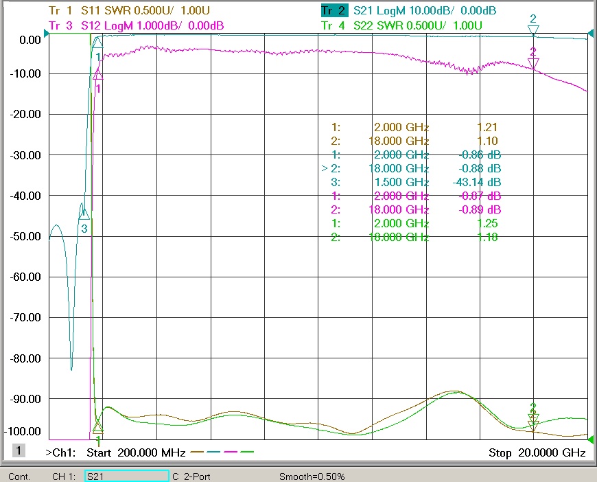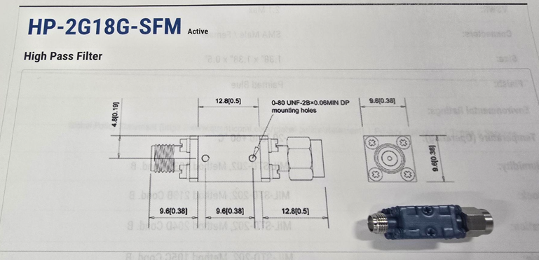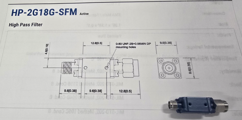 Quantic PMI Model HP-2G18G-SFM is a high pass filter designed to pass signals between 2 and 18 GHz that features 1 dB insertion loss and 40 dBc rejection below 1.5 GHz. Package size is 1.38" x 1.38" x 0.5" and comes equipped with SMA female / male connectors.
