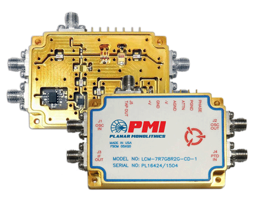 PMI Model LCM-7R7G8R2G-CD-1 is an Amplified RF Laser Control Module for use at a frequency of 7.7 GHz to 8.2 GHz with an IF range of DC to 10 KHz. It features a 20 dB voltage programmable attenuator and a 360° phase shifter. This model is designed for low spectral noise and high reverse isolation, offered in a slim line housing measuring 2.5" x 1.75" x 0.4".