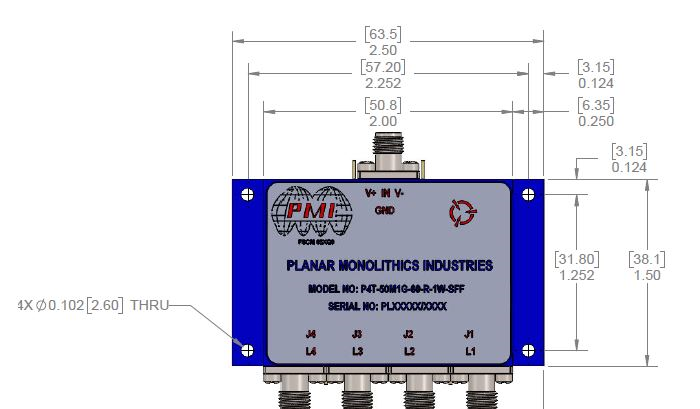 Quantic PMI Model P4T-50M1G-60-R-1W-SFF is a reflective 4 way switch covering the 0.05 to 1 GHz frequency range that incorporates a TTL compatible driver for easy system integration. Housing size is 2.5" x 1.5" x 0.75" and is outfitted with SMA female connectors.