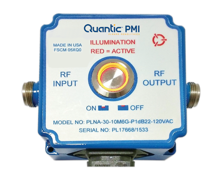 Quantic PMI Model PLNA-30-10M6G-P1dB22-120VAC is a portable amplifier that operates over the 0.01 to 6 GHz, frequency range with-90 a typical gain of 30 dB with an output P1dB of 22 dBm. This amplifier features an illuminated push button ON/OFF switch in a small package of 3.0" x 3.0" x 1.75" with Type N female connectors.